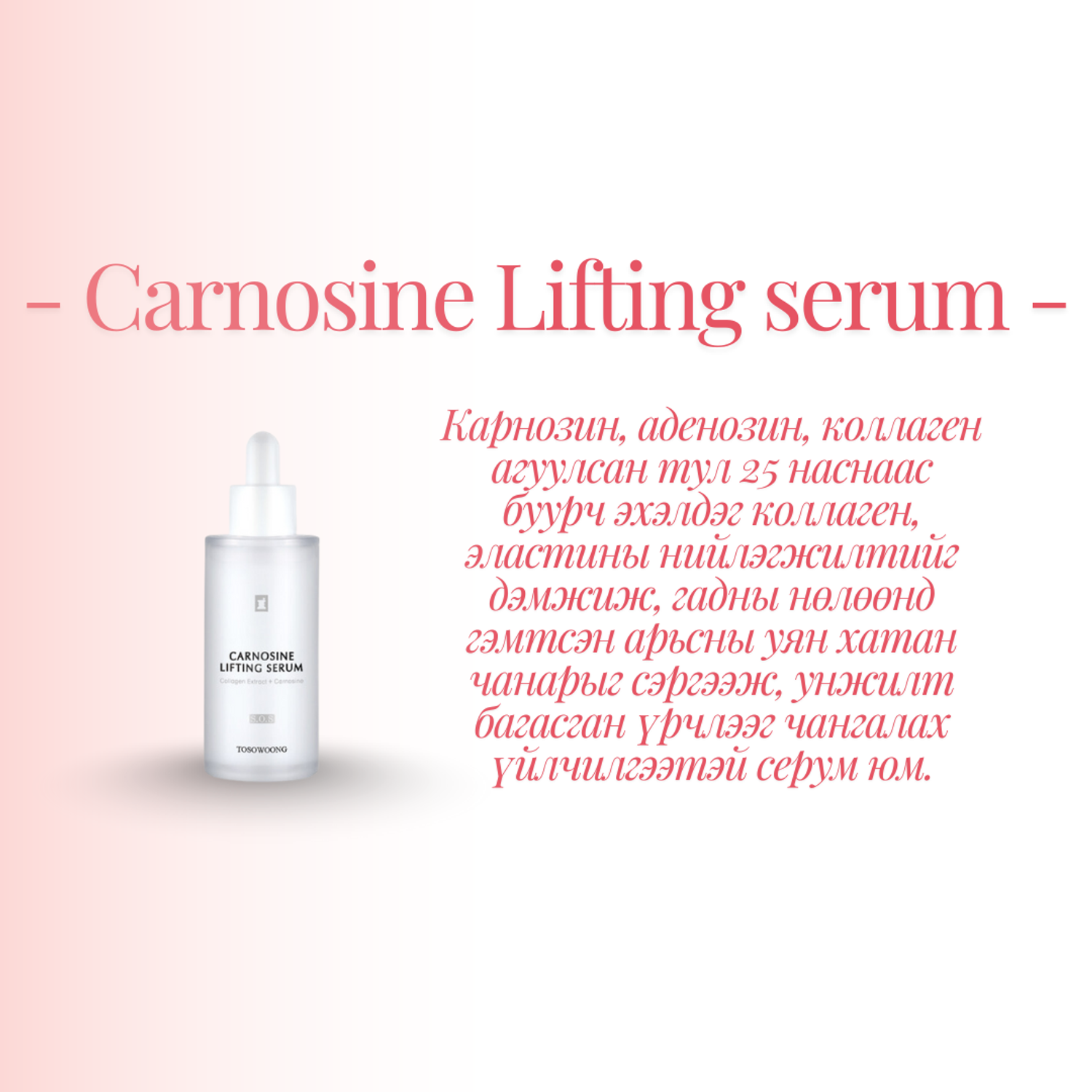 Carnosine lifting serum нь 505,500ppm уусдаг коллаген агуулсан бөгөөд үрчлээг сайжруулж, арьсыг цайруулж, чийгшүүлнэ. Арьсыг тайвшруулж, чийгшүүлэх үйлчилгээтэй ургамлын гаралтай орц найрлагатай. Арьсны доторх ус, тосны харьцааг тэнцвэржүүлнэ. Гиалуроны хүчил, ретинол болон 4 төрлийн пептид агуулсан бөгөөд арьсыг чийгшүүлж, шингээлтийг сайжруулдаг. Хүний ганц нөхөөсийн туршилтыг давсан цочрол багатай томъёо.