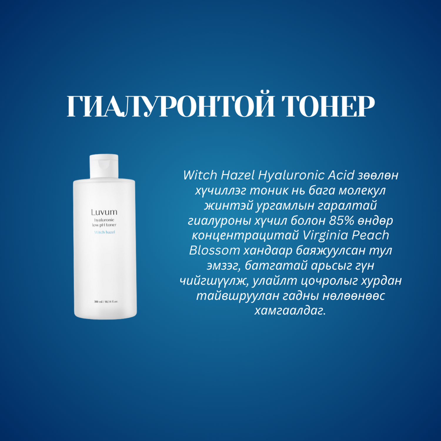 - Witch Hazel Hyaluronic Acid зөөлөн хүчиллэг тоник нь бага молекул жинтэй ургамлын гаралтай гиалуроны хүчил болон 85% өндөр концентрацитай Virginia Peach Blossom хандаар баяжуулсан тул эмзэг, батгатай арьсыг гүн чийгшүүлж, улайлт цочролыг хурдан тайвшруулан гадны нөлөөнөөс хамгаалдаг.