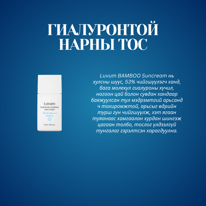 - Luvum BAMBOO Suncream нь хулсны шүүс, 53% чийгшүүлэгч ханд, бага молекул гиалуроны хүчил, ногоон цай болон сувдан хандаар баяжуулсан тул мэдрэмтгий арьсанд ч тохиромжтой, арьсыг өдрийн турш гүн чийгшүүлж, хэт ягаан туяанаас хамгаалан хурдан шингэж цагаан толбо, тослог үлдээлгүй тунгалаг гэрэлтсэн харагдуулна.
