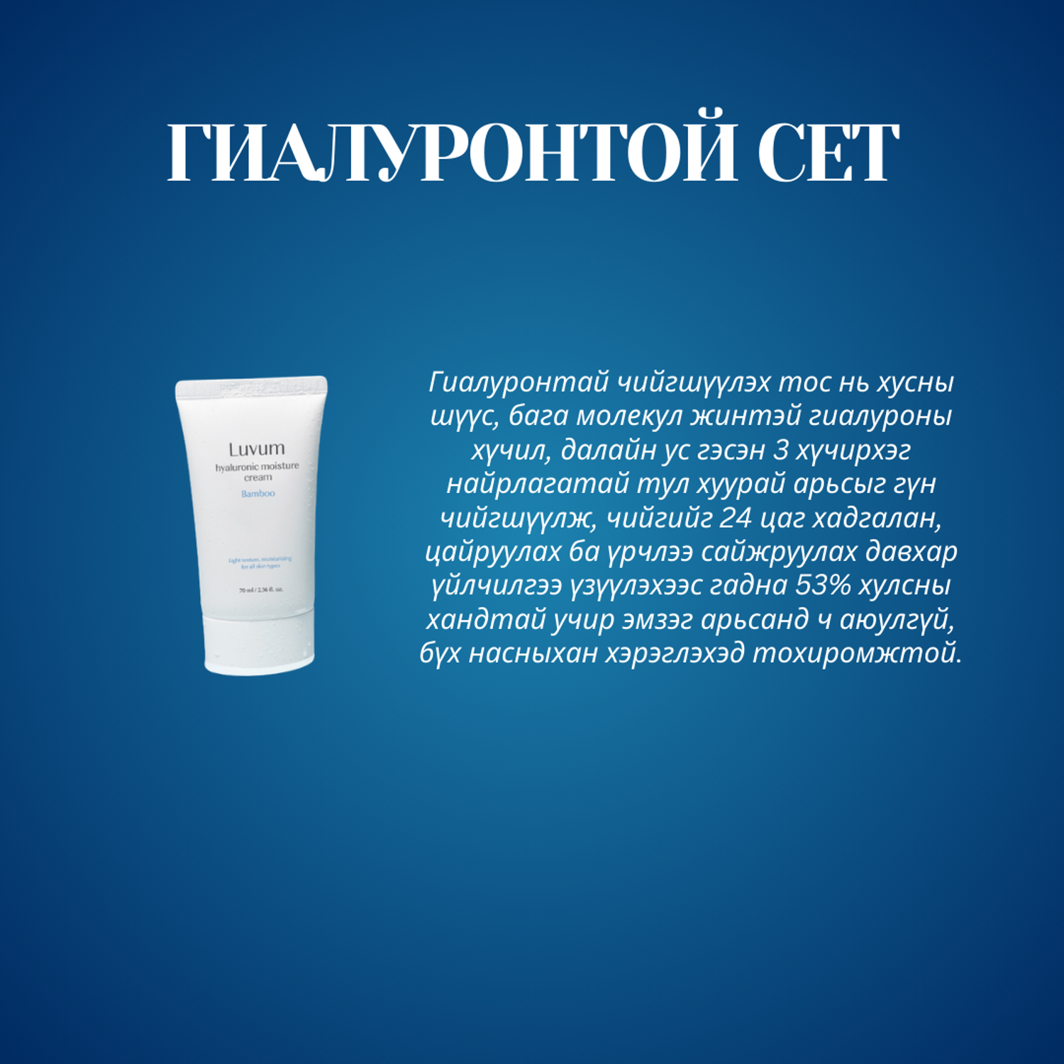 Гиалуронтай чийгшүүлэх сэт нь өөрийн жингээсээ 1000 дахин өндөр чийгшүүэх найрлагтай хөнгөн зөөлөн усан суурьтай.