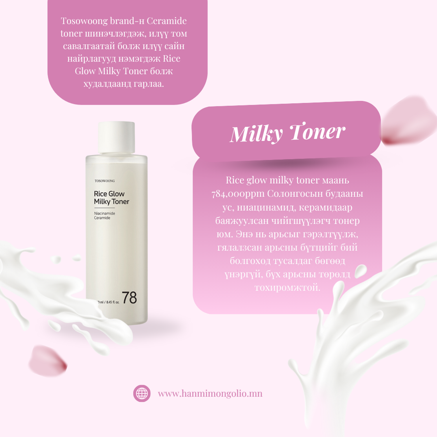 Milky Toner- Rice glow milky toner маань 784,000ppm Солонгосын будааны ус, ниацинамид, керамидаар баяжуулсан чийгшүүлэгч тонер юм. Энэ нь арьсыг гэрэлтүүлж, гялалзсан арьсны бүтцийг бий болгоход тусалдаг бөгөөд үнэргүй, бүх арьсны төрөлд тохиромжтой. Tosowoong brand-н Ceramide toner шинэчлэгдэж, илүү том савалгаатай болж илүү сайн найрлагууд нэмэгдэж Rice Glow Milky Toner болж худалдаанд гарлаа.