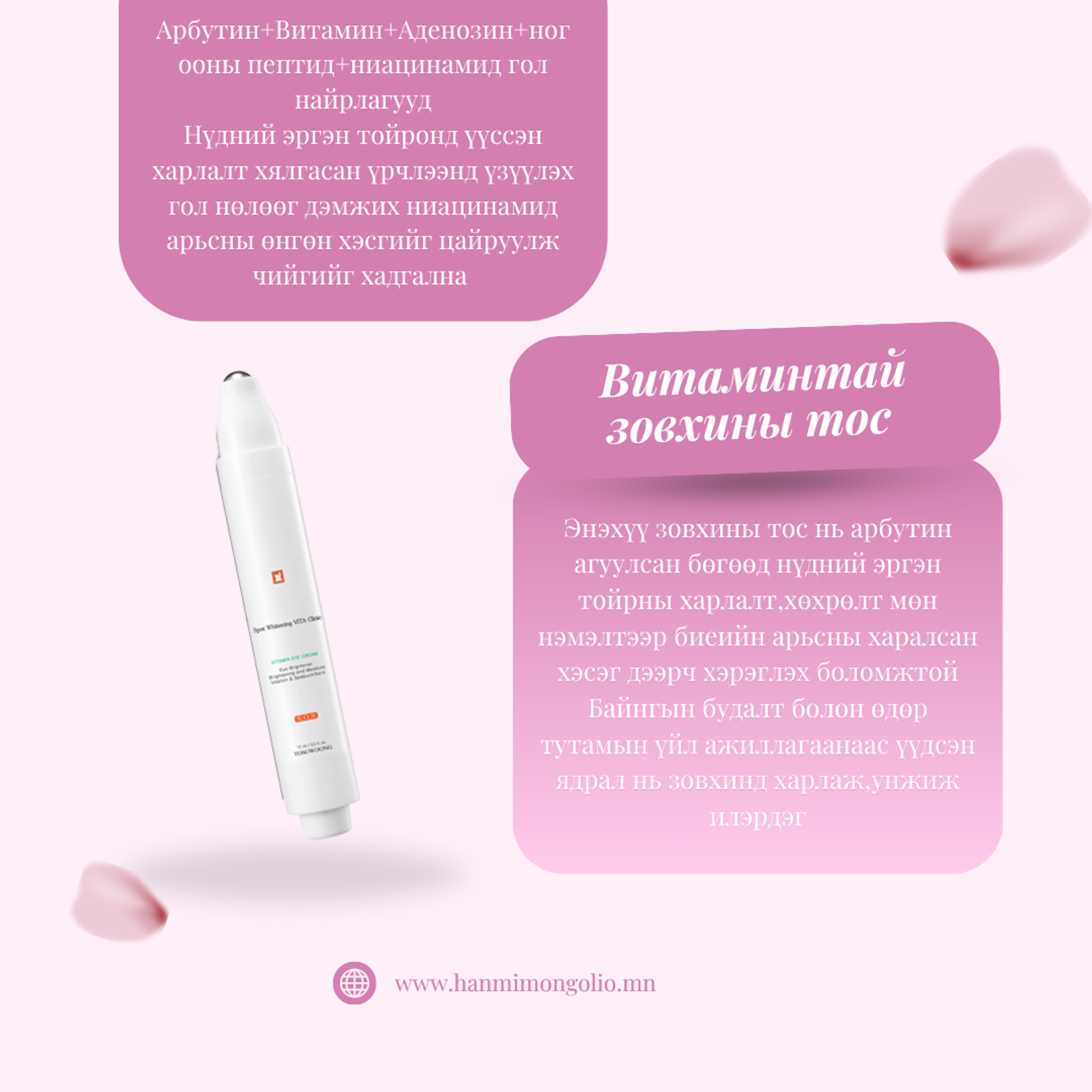 Витаминтай зовхины тос- Энэхүү зовхины тос нь арбутин агуулсан бөгөөд нүдний эргэн тойрны харлалт,хөхрөлт мөн нэмэлтээр биеийн арьсны харалсан хэсэг дээрч хэрэглэх боломжтой