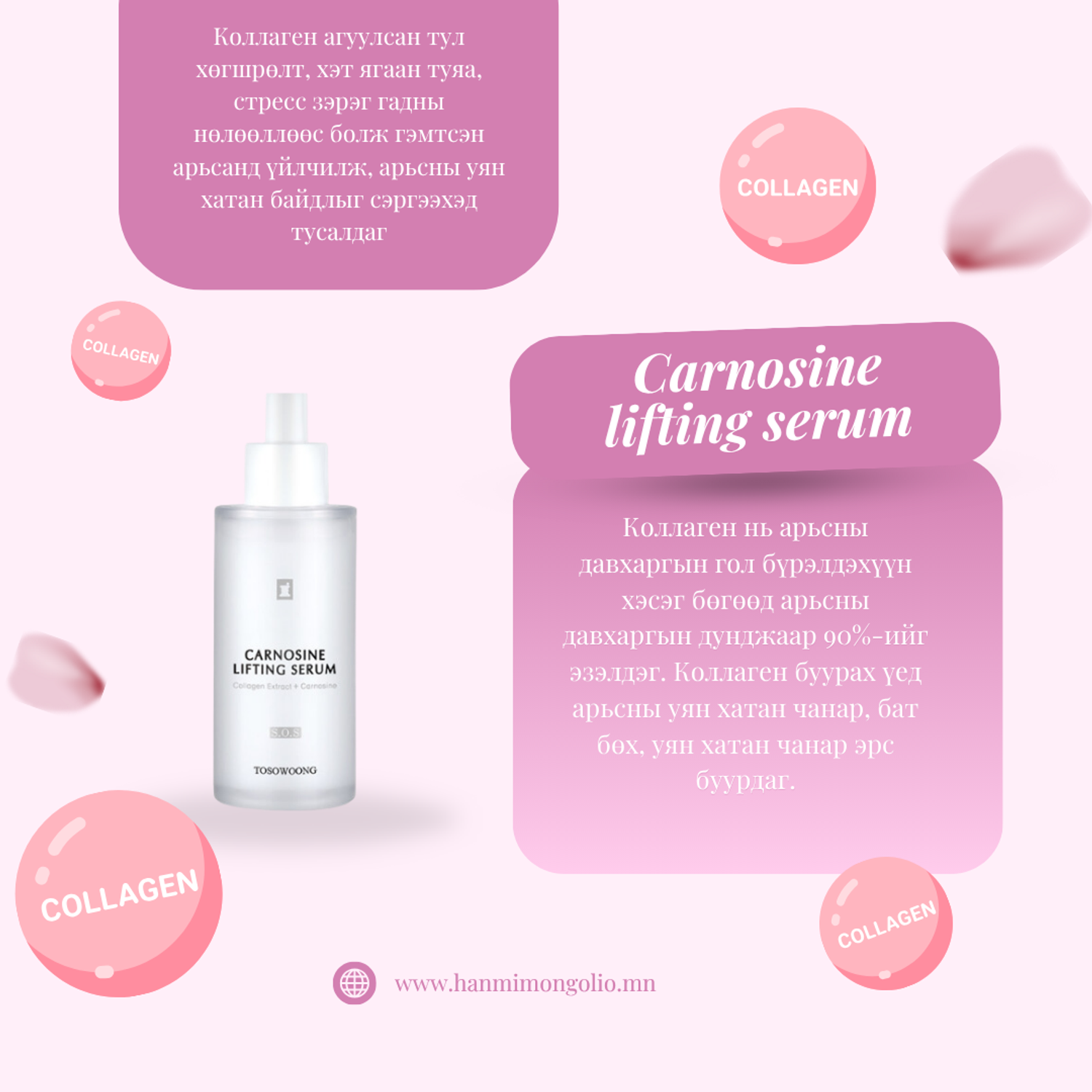 Carnosine lifting serum- Коллаген нь арьсны давхаргын гол бүрэлдэхүүн хэсэг бөгөөд арьсны давхаргын дунджаар 90%-ийг эзэлдэг. Коллаген буурах үед арьсны уян хатан чанар, бат бөх, уян хатан чанар эрс буурдаг. Коллаген агуулсан тул хөгшрөлт, хэт ягаан туяа, стресс зэрэг гадны нөлөөллөөс болж гэмтсэн арьсанд үйлчилж, арьсны уян хатан байдлыг сэргээхэд тусалдаг