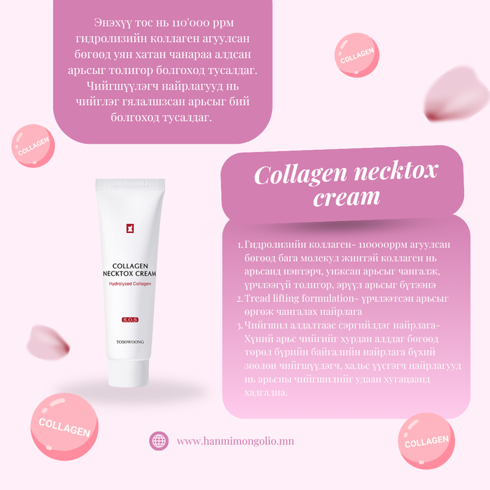 Collagen necktox cream- Гидролизийн коллаген- 110000ррм агуулсан бөгөөд бага молекул жинтэй коллаген нь арьсанд нэвтэрч, унжсан арьсыг чангалж, үрчлээгүй толигор, эрүүл арьсыг бүтээнэ, Tread lifting formulation- үрчлээтсэн арьсыг өргөж чангалах найрлага, Чийгшил алдалтаас сэргийлдэг найрлага- Хүний арьс чийгийг хурдан алддаг бөгөөд төрөл бүрийн байгалийн найрлага бүхий зөөлөн чийгшүүлэгч, хальс үүсгэгч найрлагууд нь арьсны чийгшилийг удаан хугацаанд хадгална.