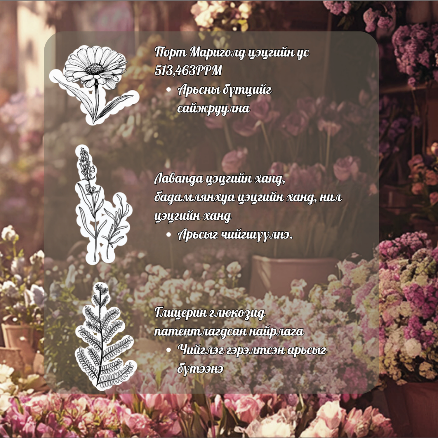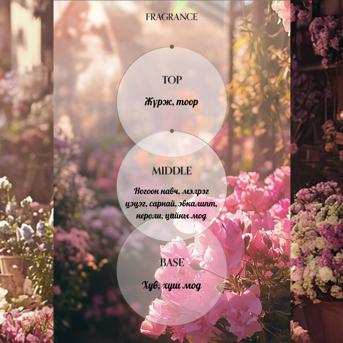 - Анхилуун үнэртэй төдийгүй жинхэнэ цэцгийн ус их хэмжээгээр агуудж байгаа нь таныг цэцгийн цэцэрлэг дунд байгаа мэт тансаг мэдрэмжийг төрүүлнэ.