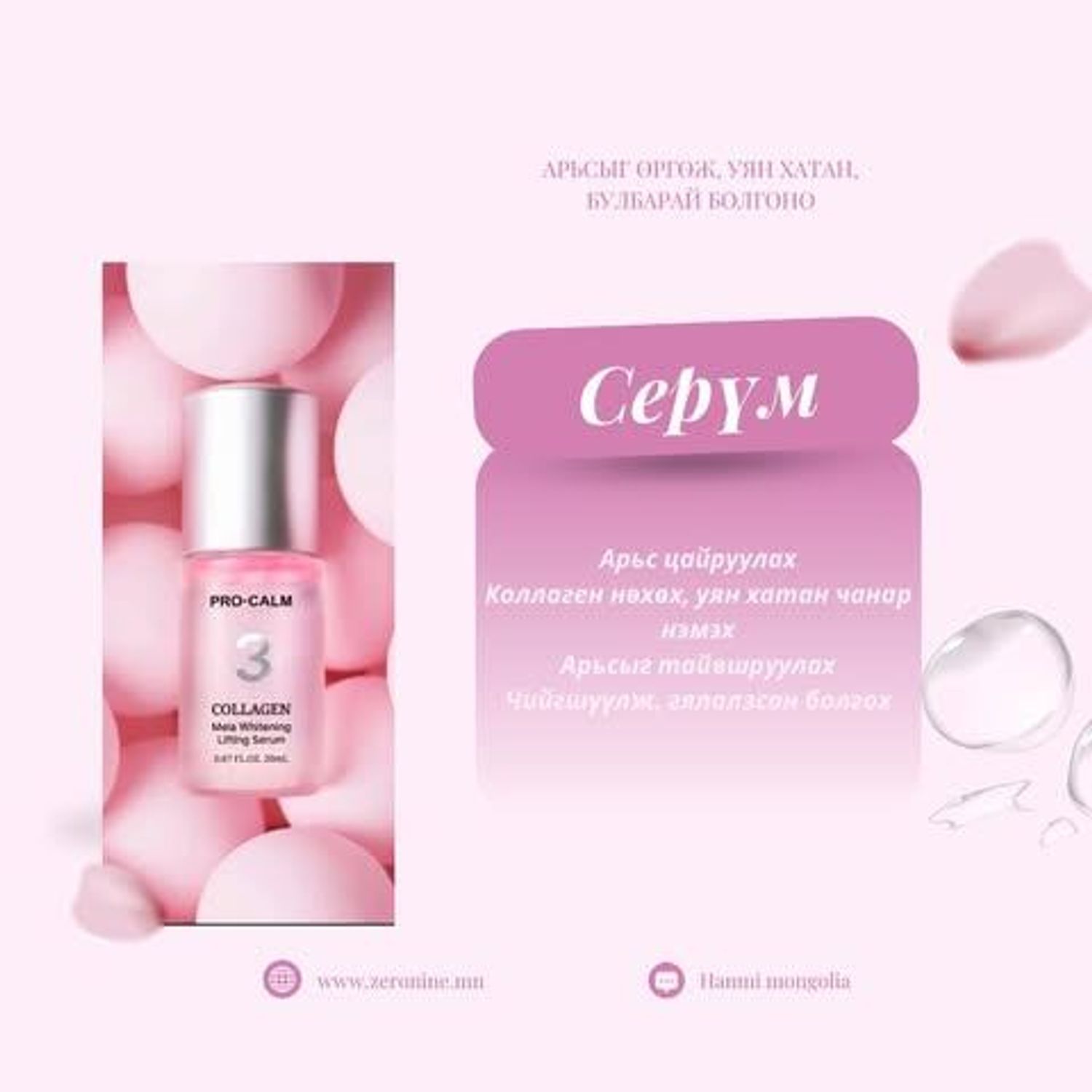Арьсны эсийн мембрам болох олон мянган жижиг эсүүдийг сэргээж, давхарга бүрт шаардлагатай коллаген, гиалурон, керамид зэрэг орцуудын арьсандаа дүүргэх тарилганы найрлагуудтай сэрүмийг өөртөө зориулан өдөр бүр арьсанд товшилт бүрээр шингээн хэрэглэж арьсаа залуу, шинэхэн, гэрэлтсэн төрхийг бүтээгээрэй