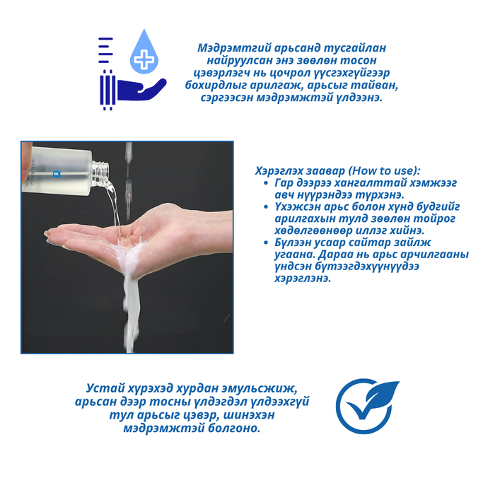 - Цэвэрлэсний дараа арьсыг сэргээж, үлдэгдэл мэдрэмжгүй, арьсыг хуурайшуулахгүйгээр цэвэрхэн үлдээнэ.