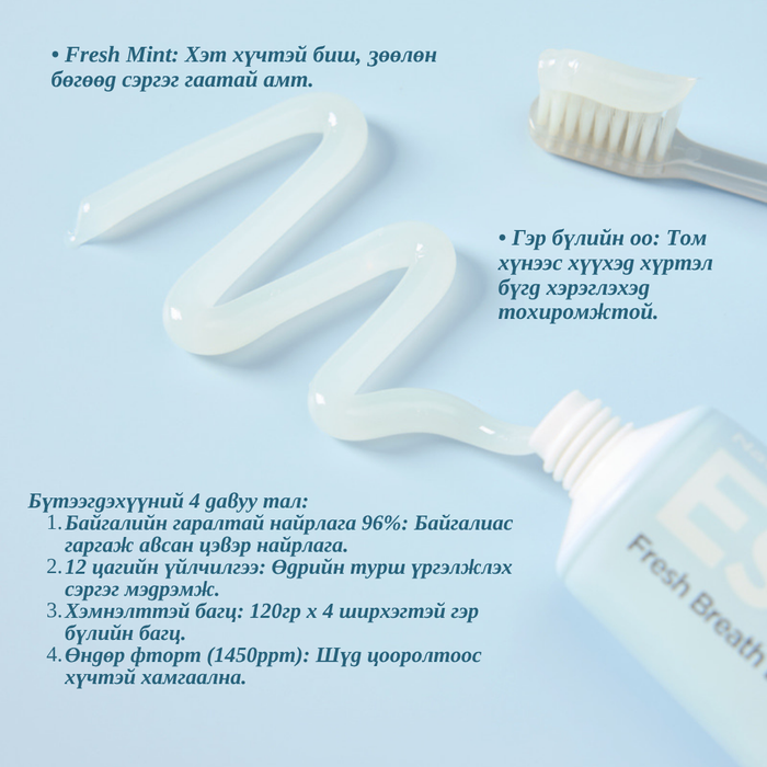 • Хүчтэй хамгаалалт (1450ppm Фтор): Шүдний пааланг бэхжүүлж, шүд цоорохоос дээд зэргээр сэргийлнэ.