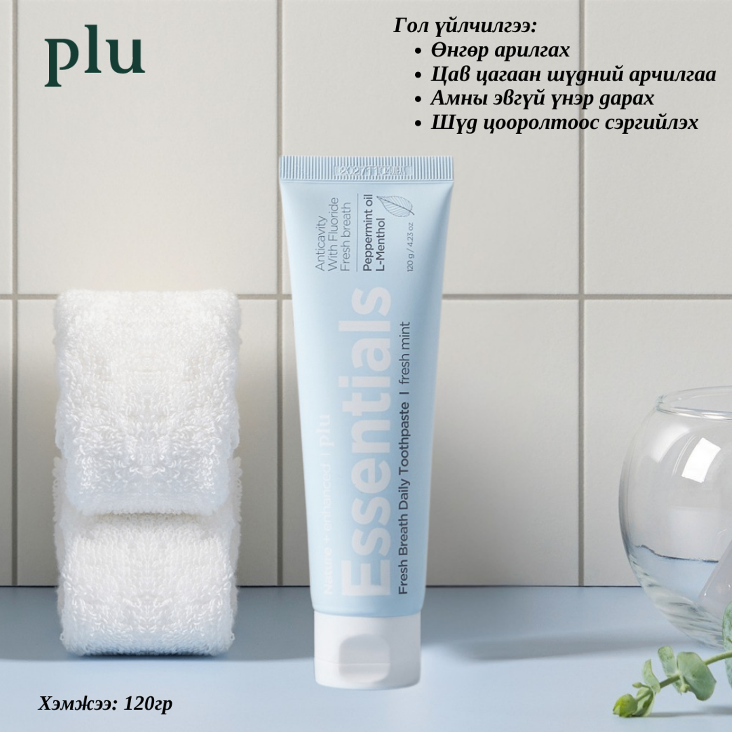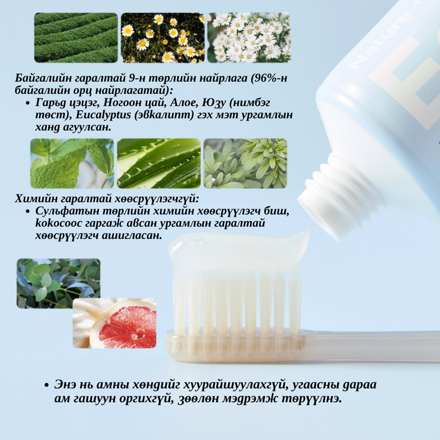 Ногоон цай, алое, эвкалипт зэрэг 9 төрлийн ургамлын ханд агуулсан тул амны хөндийн бактераас хамгаалж, байгалийн цэвэр шинэлэг байдлыг мэдрүүлнэ.