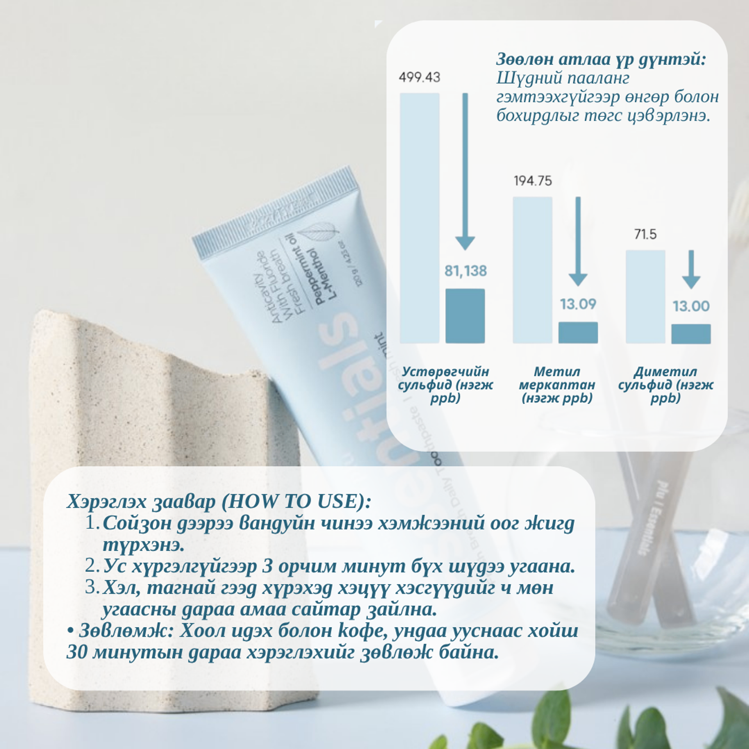 • 12 цагийн турш амны үнэр дарагч: Эмнэлзүйн туршилтаар амны эвгүй үнэр үүсгэгч хийг 92%-иар бууруулж, үйлчилгээ нь 12 цаг тогтвортой хадгалагдахыг баталсан.
