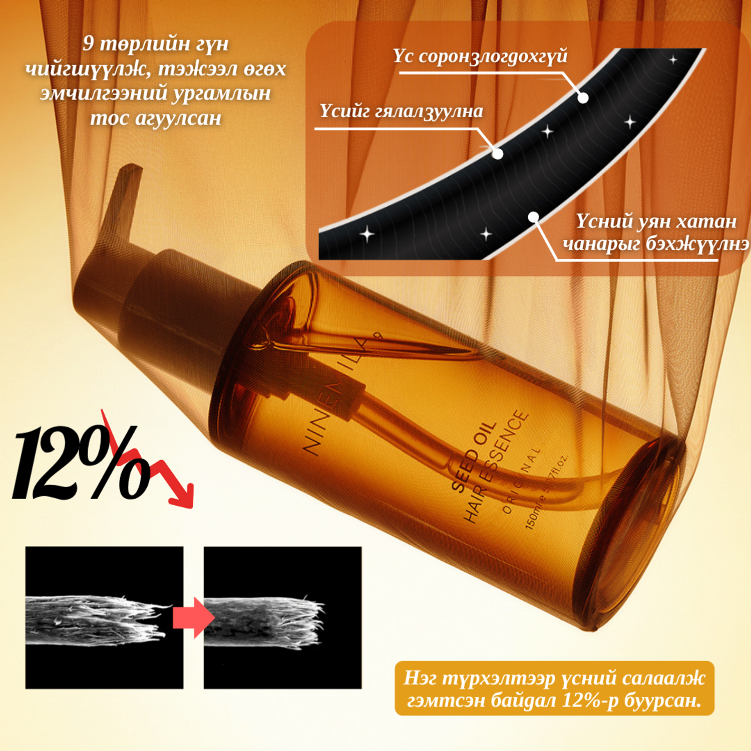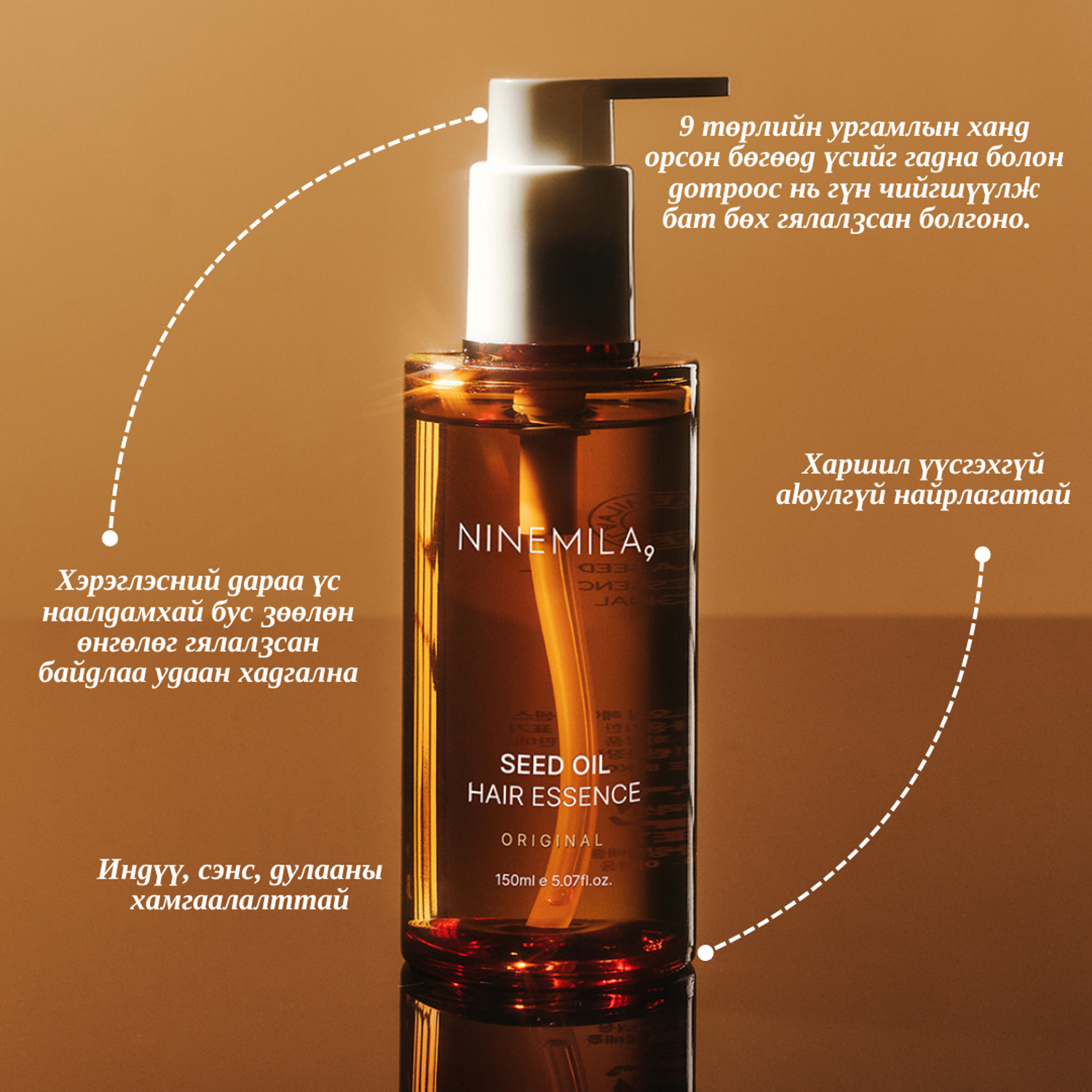 Энэхүү үсний эссенц нь 9 төрлийн ургамлын ханд болон эмчилгээний тос агуулсан бөгөөд үсийг гадна болон дотор талаас нь гүн чийгшүүлж, тэжээл өгөх үйлчилгээтэй. 150мл савлагаатай энэхүү тос нь үсийг хүндрүүлж наалдуулахгүйгээр зөөлөн, гялалзсан болгодог.