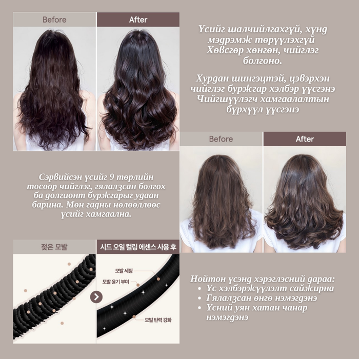 Дулааны хамгаалалт: Сэнс, индүү зэрэг 80–220°C хүртэлх халууны нөлөөллөөс үсийг хамгаалж, гэмтэл, хугарал, хуурайшилтаас хамгаална.