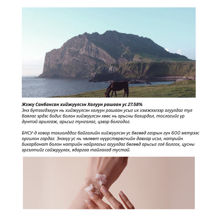 Энэ бүтээгдэхүүн нь хийжүүлсэн халуун рашаан усыг их хэмжээгээр агуулдаг тул баялаг эрдэс бодис болон хийжүүлсэн хөөс нь арьсны бохирдол, тослогийг үр дүнтэй арилгаж, арьсыг тунгалаг, цэвэр болгодог.