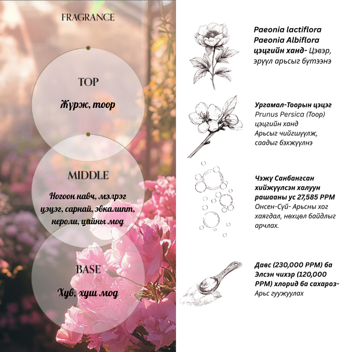 Бүтээгдэхүүнийг биед түрхсэний дараа зөөлөн дулаан мэдрэгдэж, саунд байгаа мэт түр зуурын дулаахан мэдрэмжийг төрүүлнэ. Массаж хийх үед аажмаар мэдрэгдэх энэ дулаан болон баялаг цэцгийн үнэр нь биеийг амрааж, тайвшруулахад тусална.