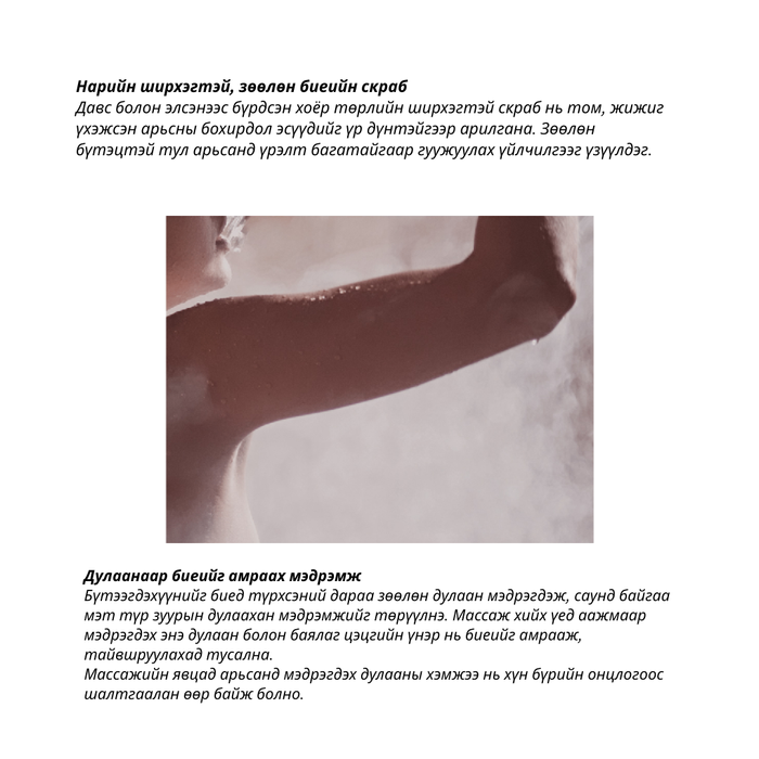 Давс болон элсэнээс бүрдсэн хоёр төрлийн ширхэгтэй скраб нь том, жижиг үхэжсэн арьсны бохирдол эсүүдийг үр дүнтэйгээр арилгана. Зөөлөн бүтэцтэй тул арьсанд үрэлт багатайгаар гуужуулах үйлчилгээг үзүүлдэг.